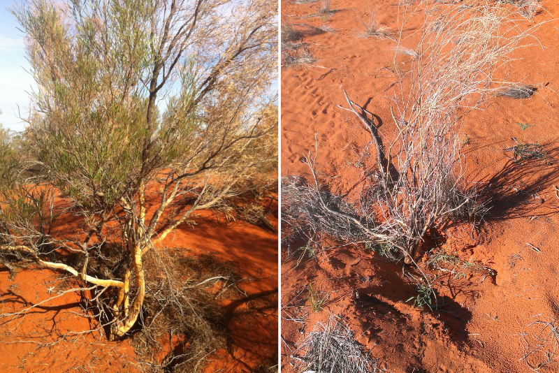 Bettongs have dug around a sticky hopbush (Dodonaea viscosa subsp. viscosa) (left) and desert rattlepod (crotalaria eremaea) (right) damaging them.