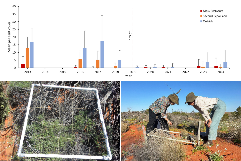 Ruby saltbush (Enchylaena tomentosa) (bottom left) are monitored annually using quadrats to estimate cover (bottom right). We found that ruby saltbush cover was lower inside the reserve compared with outside (above).