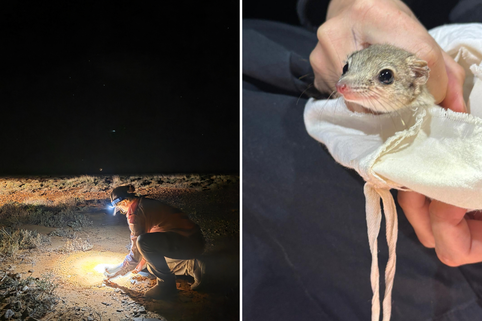 Phd Candidate and Team Kowari President Molly Barlow checks a trap (left), and a kowari about to be released after being processed (right). This article is based on a presentation delivered by Arid Recovery Ecologist Caitlin Rutherford at the Ecological Society of Australia (ESA) 2025 Conference in Adelaide. Co-authors were Molly Barlow, Katherine Tuft, Katherine Moseby, Lauren Young and Genevieve Hayes.