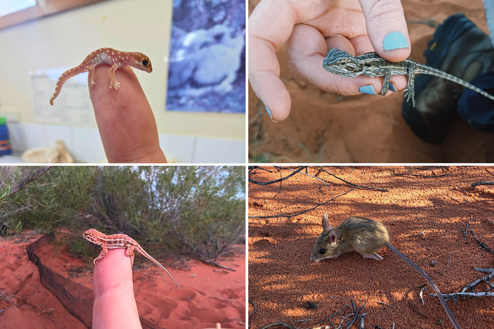 "I'm just a baby" — a juvenile beaked gecko (top left), a juvenile bearded dragon (top right), a juvenile kartiwarru dragon (bottom left), and a sub-adult spinifex hopping mouse (bottom right).