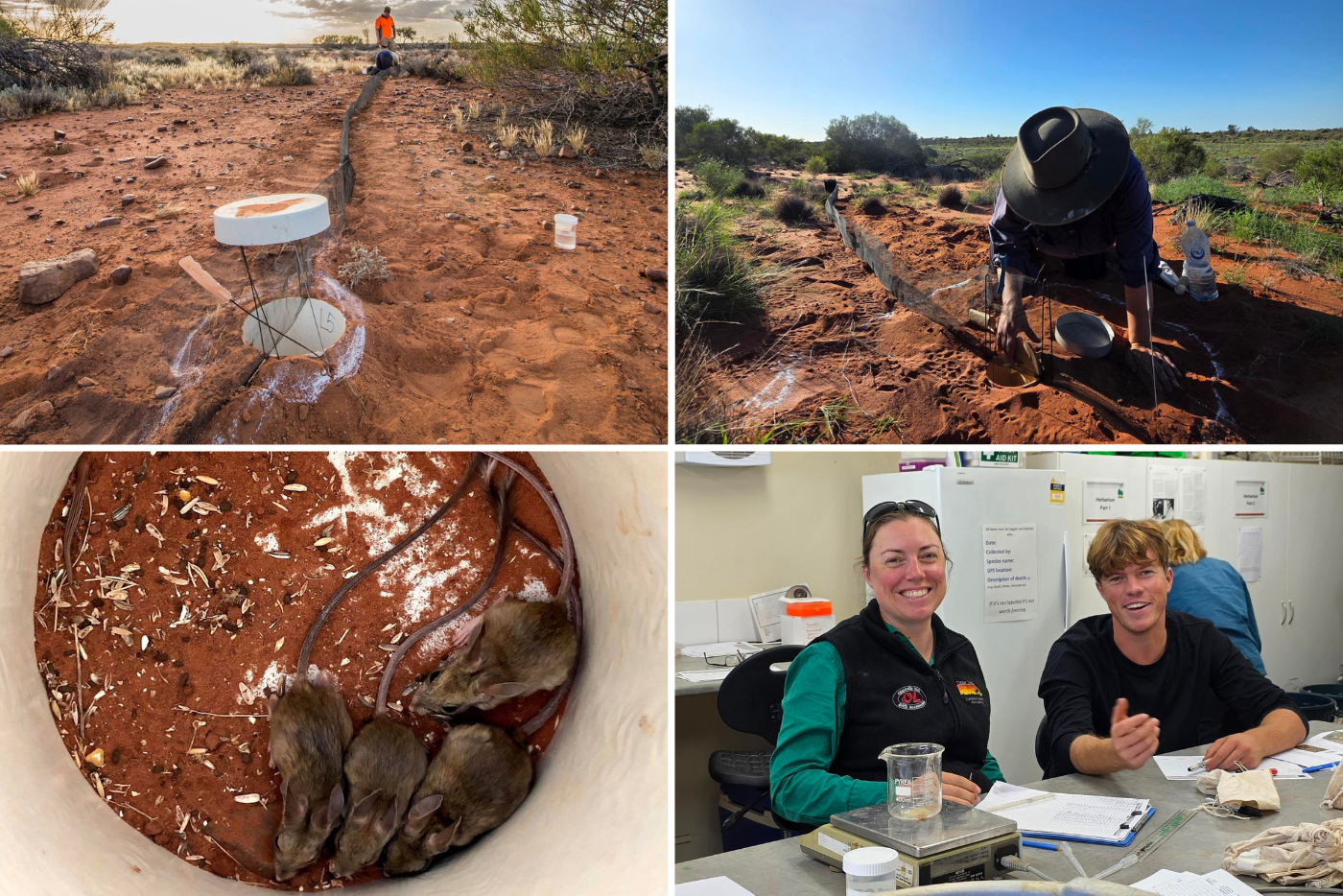Pitfall lines with buckets flush with the ground and mesh fences in between (top left), checking the pits every morning and afternoon (top right), animals run along the fence and fall in the buckets (bottom left), and are collected and taken back to the lab to be measured (bottom right)This survey forms part of one of the longest-running pitfall trapping programs in Australia. That long-term perspective is what gives it real value. A recent paper published in 2025, based on this dataset, showed that ecological change in arid systems often happens slowly and continues to unfold over decades.