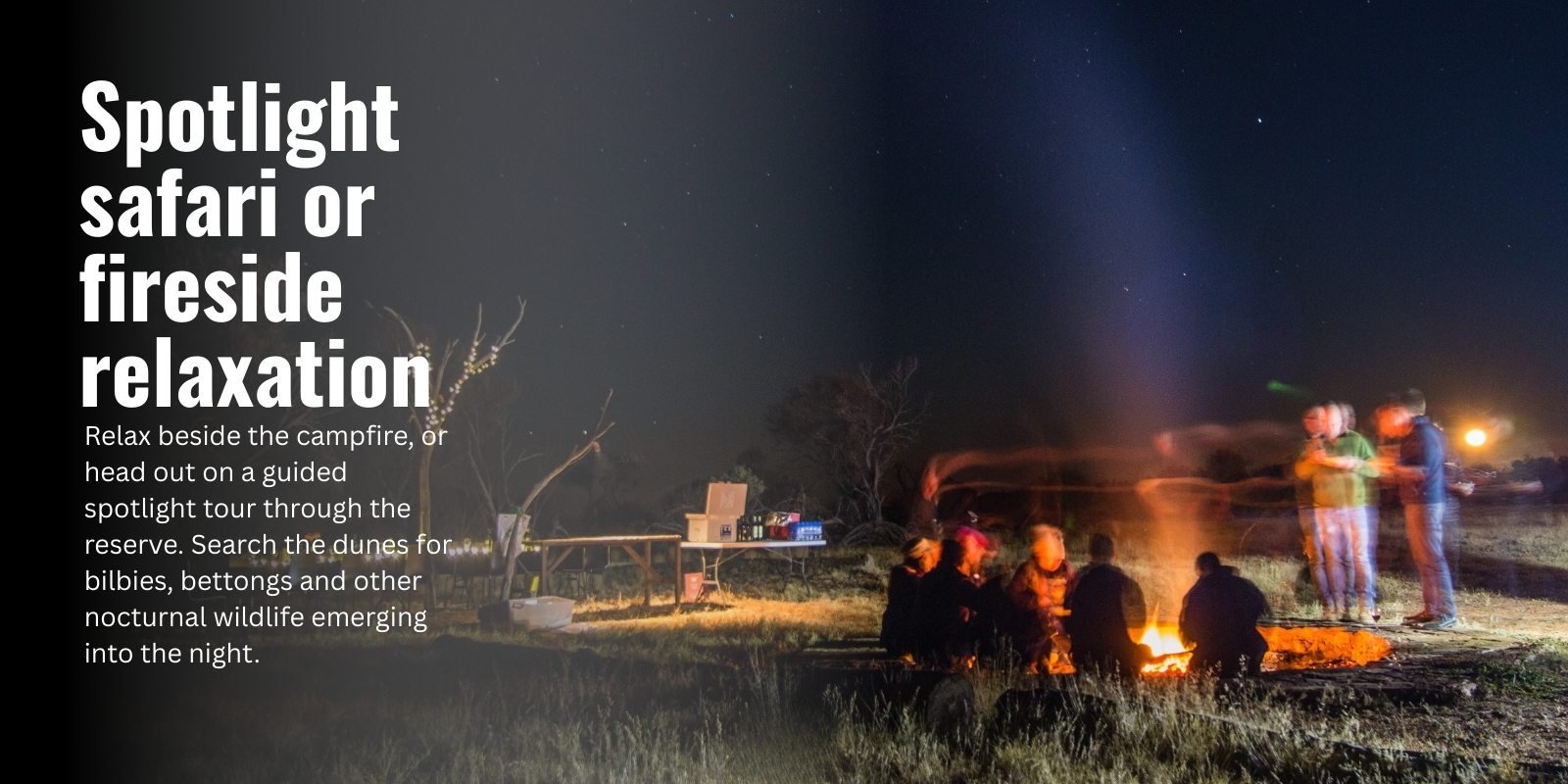 As darkness settles, you can relax beside the campfire or head out on a guided spotlight safari, searching for bilbies, bettongs and other nocturnal wildlife emerging into the night.